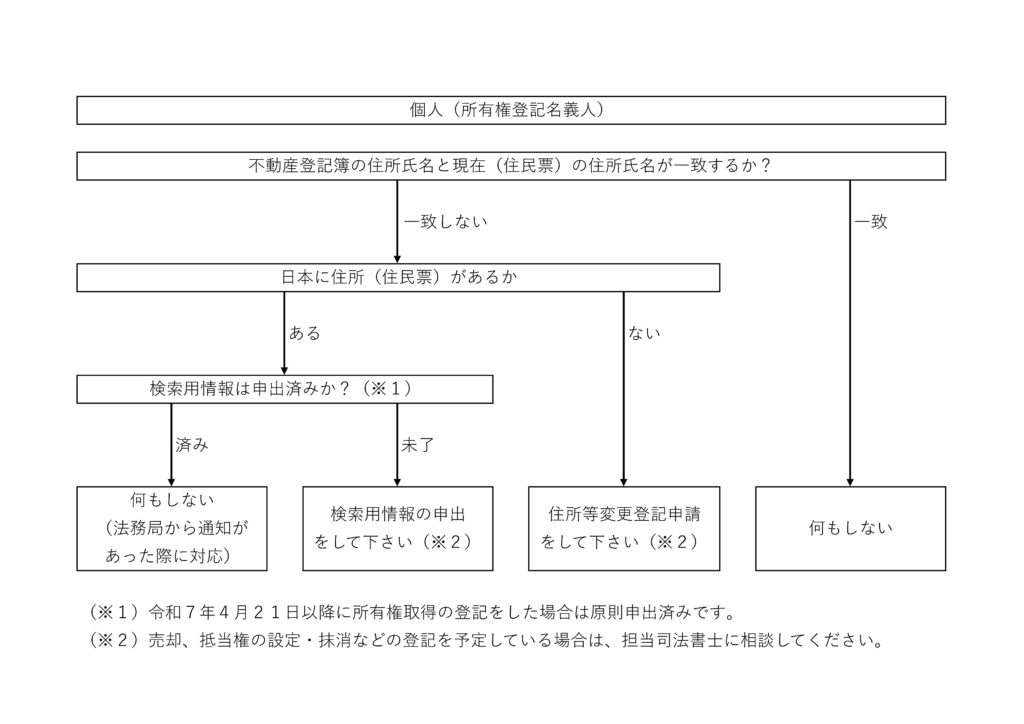 「検索用情報」とは、住所、氏名、フリガナ、生年月日のことであり、法務局に検索用情報を登録しておくと、法務局が住基ネットで住所等の変更の確認ができるようになります。2025年(令和7年)4月21日以降に所有権の登記をする場合は、所有権の登記と同時に検索用情報の申出をすることになっています。